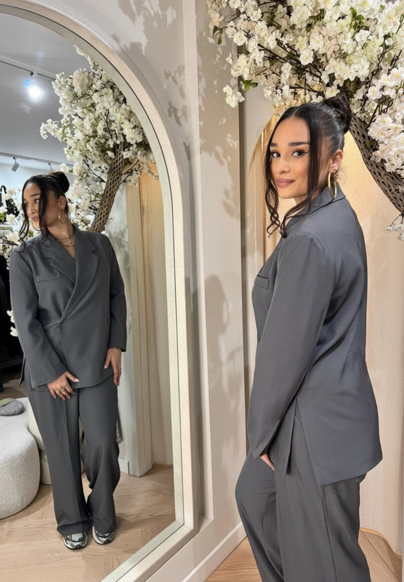 Prachtige oversized blazer met splitjes aan de zijkant en een overlay aan de voorkant. Stijlvol te dragen als compleet pak, op een jeans of voor de kortere dames als jurkje.
