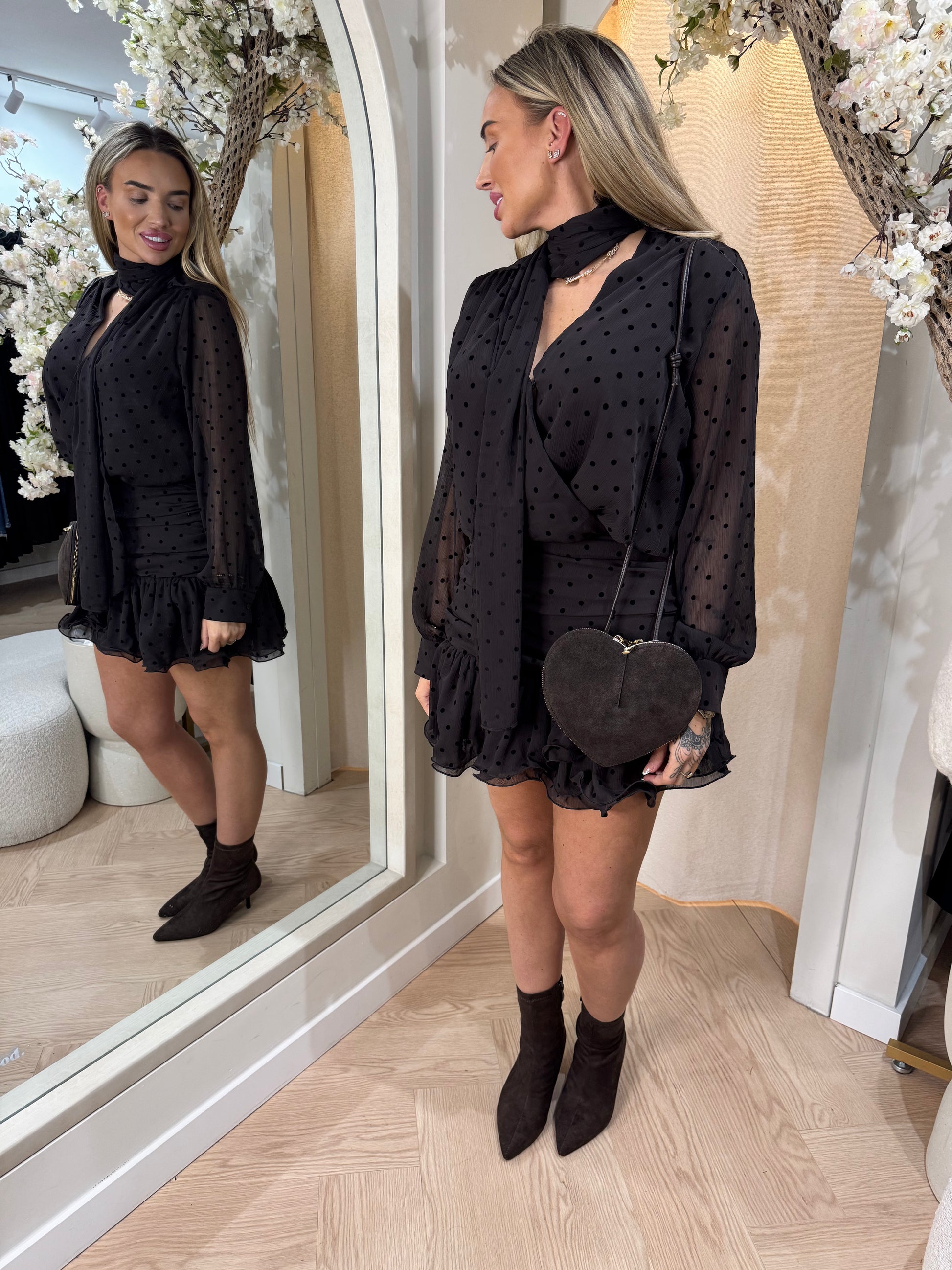Stippenjurkje met vast hangend sjaaltje. Gemaakt van een lichte stof en geschikt voor zowel casual als nette gelegenheden.