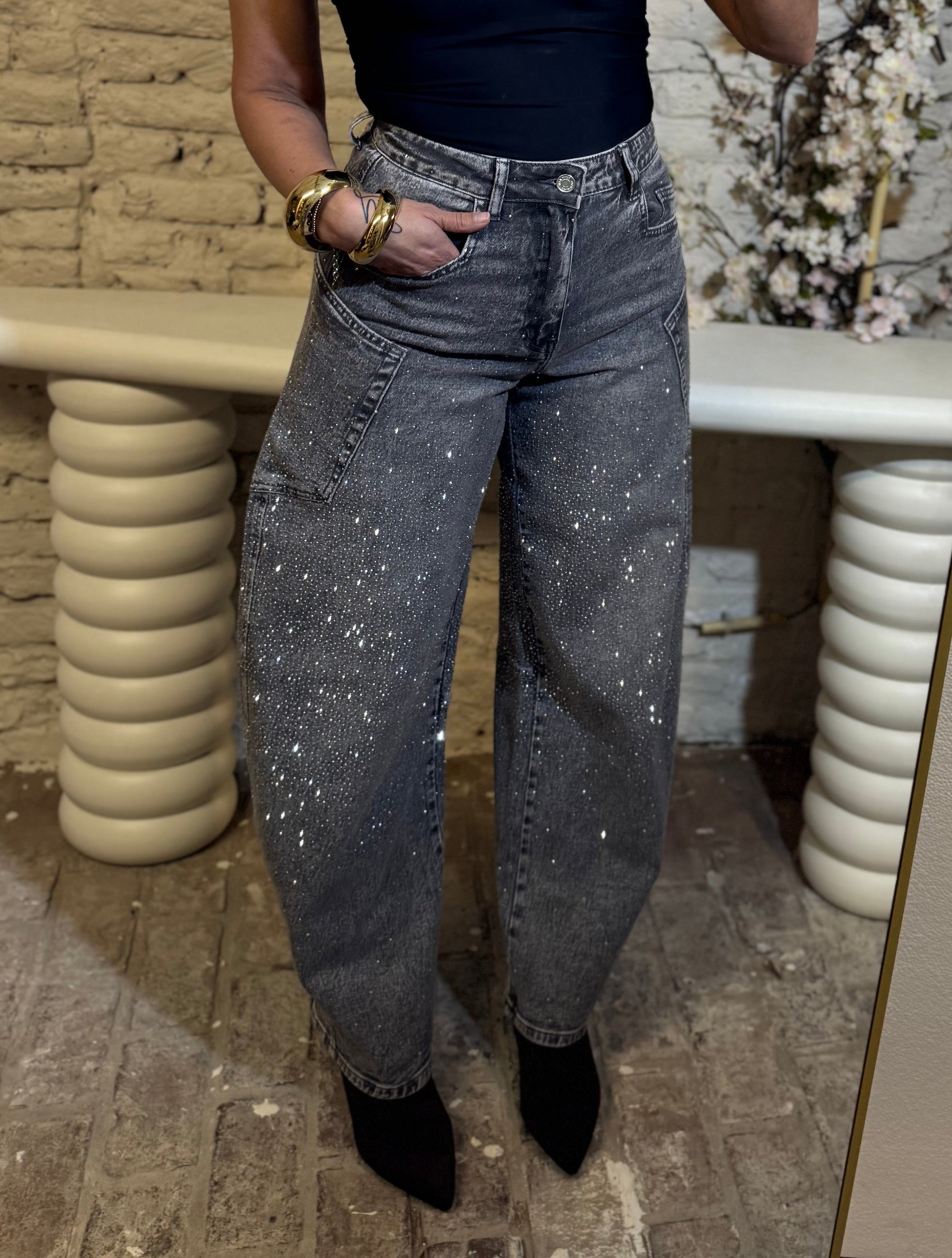 Hoe leuk is deze heerlijk zittende balloon jeans, volledig versierd met strass steentjes. Superleuk om stoer te combineren voor een extra vrouwelijke touch! Ook prachtig met een hakje en een mooie body, zo ben je helemaal ready voor een avondje uit.